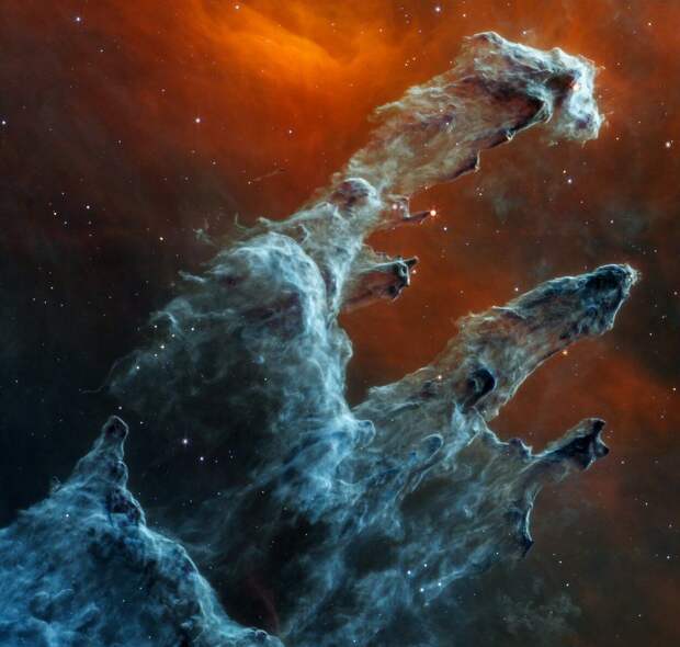 Изображение Столпов Творения в среднем инфракрасном диапазоне, полученное космическим телескопом Джеймса Уэбба.