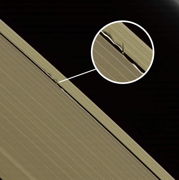 Удивительно: гравитация спутника Сатурна Дафниса создает странные вертикальные структуры в материале кольца планеты высотой до 2,5 километров, которые, в свою очередь, отбрасывают тени на кольцо!